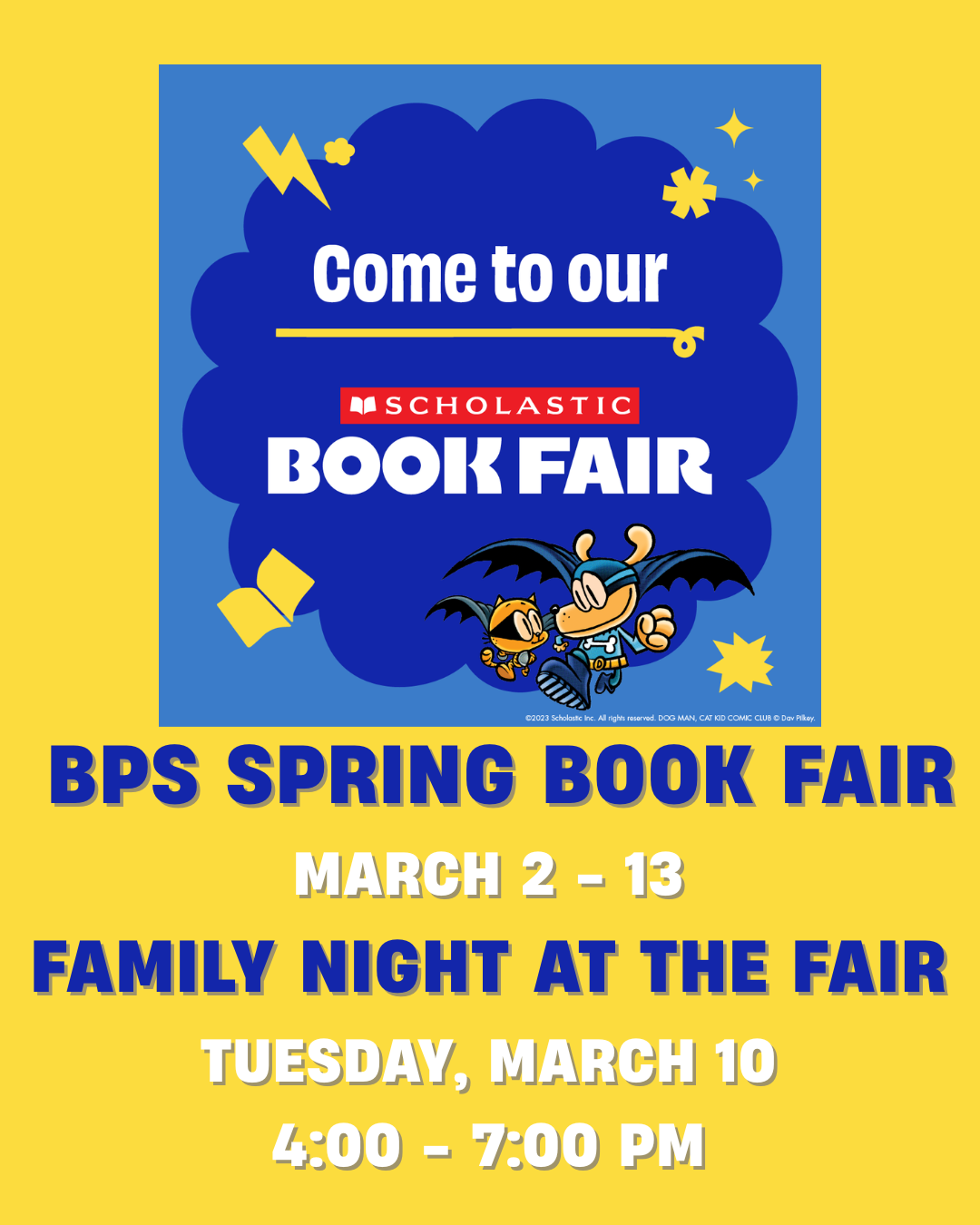 The BPS Book Fair runs from March 2nd through March 13th. The BPS Book Fair Family Night is Tuesday, March 10th, from 4:00-7:00 PM.