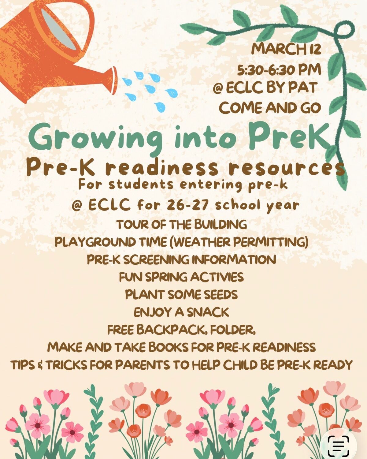 SPREAD THE WORD! If you or someone you know has a student entering ECLC next school year, please join us for a Growing into PreK event! It is Thursday, March 12th, from 5:30-6:30 PM at ECLC. It will be a come-and-go event!